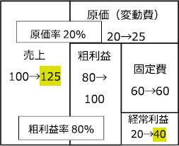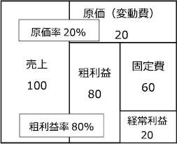 現状、『売上100、原価(変動費)20、粗利益80、固定費60、経常利益20、原価率20%、粗利益率80%』と仮定します。