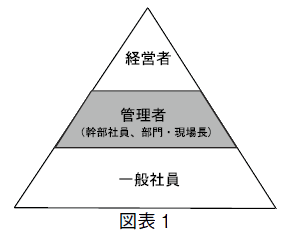 社員が増え10 名を超えてくると、社長一人では全社員に目が行き届かなくなります。組織は「経営者」「管理者(幹部社員、部門長など)」「一般社員」という3 層構造で、管理者は経営者と一般社員をつなぐ要として重要な役割を担います(図表1)。