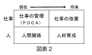 幹部社員の育成とのことですが、一口に幹部社員といっても、社長の代行者として経営全般を担ってもらいたいのか、担当部門の統括を期待するのかにより、求められる能力は異なります。前者であれば高い経営判断力が必要ですし、後者であれば担当業務に加え、仕事と人の管理が重要です(図表2)。