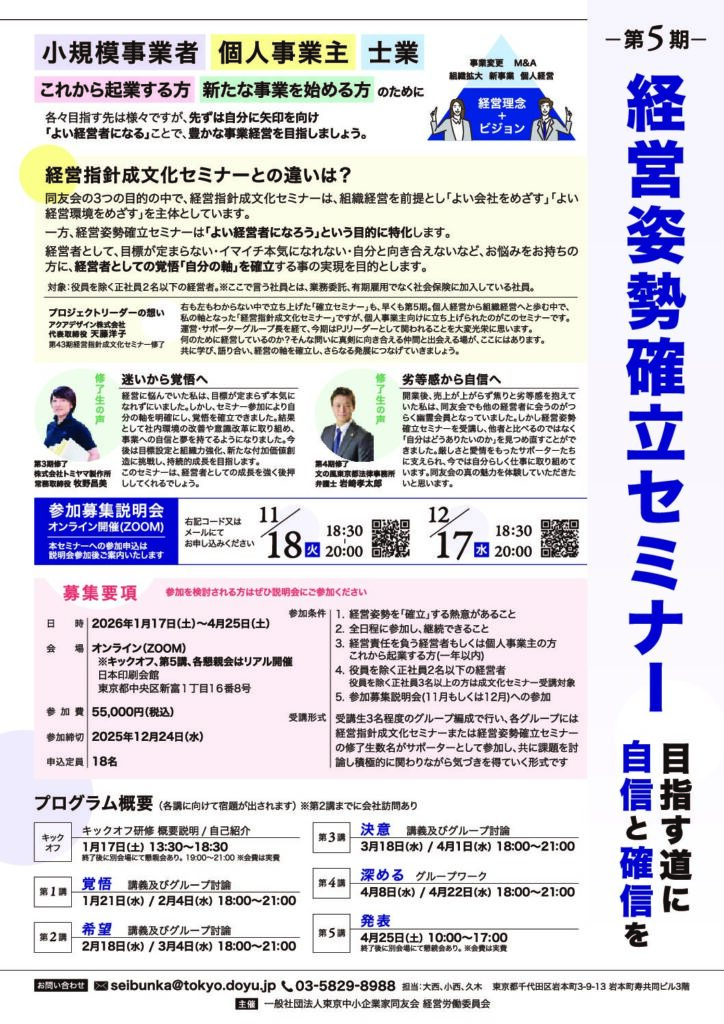 「経営姿勢確立セミナー」をオンライン中心で開催しています。